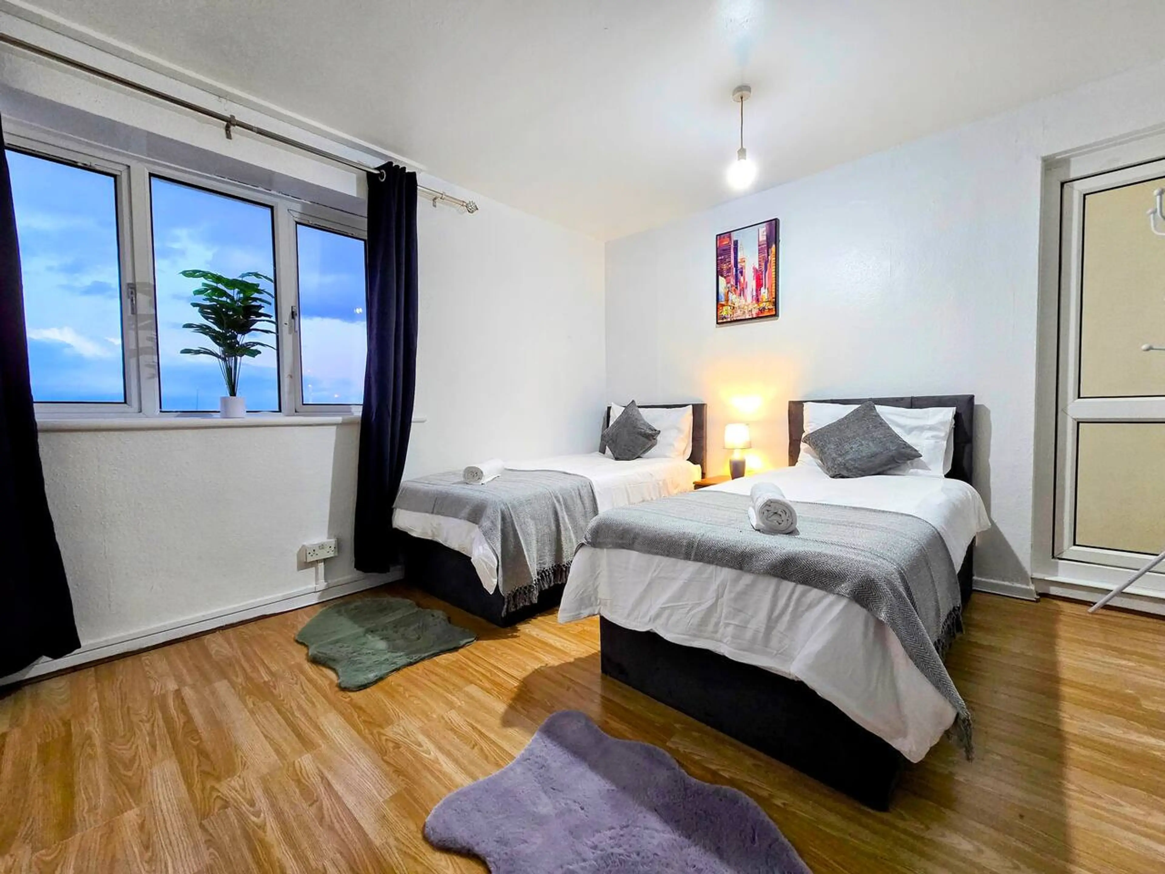 Forget your worries in this spacious and serene space. We offer up to 6 guests! Contractors are welcome ! 1 double bed and 4 single beds ! Parking can be arranged with extra payment depends on availability!! We prefer long term booking! The Space This 3-bedroom flat offers a welcoming and functio...